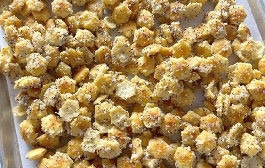 - Combine ingredients: In a large bowl, whisk together melted butter, everything bagel seasoning, and Parmesan cheese. Add the oyster crackers and toss until evenly coated.